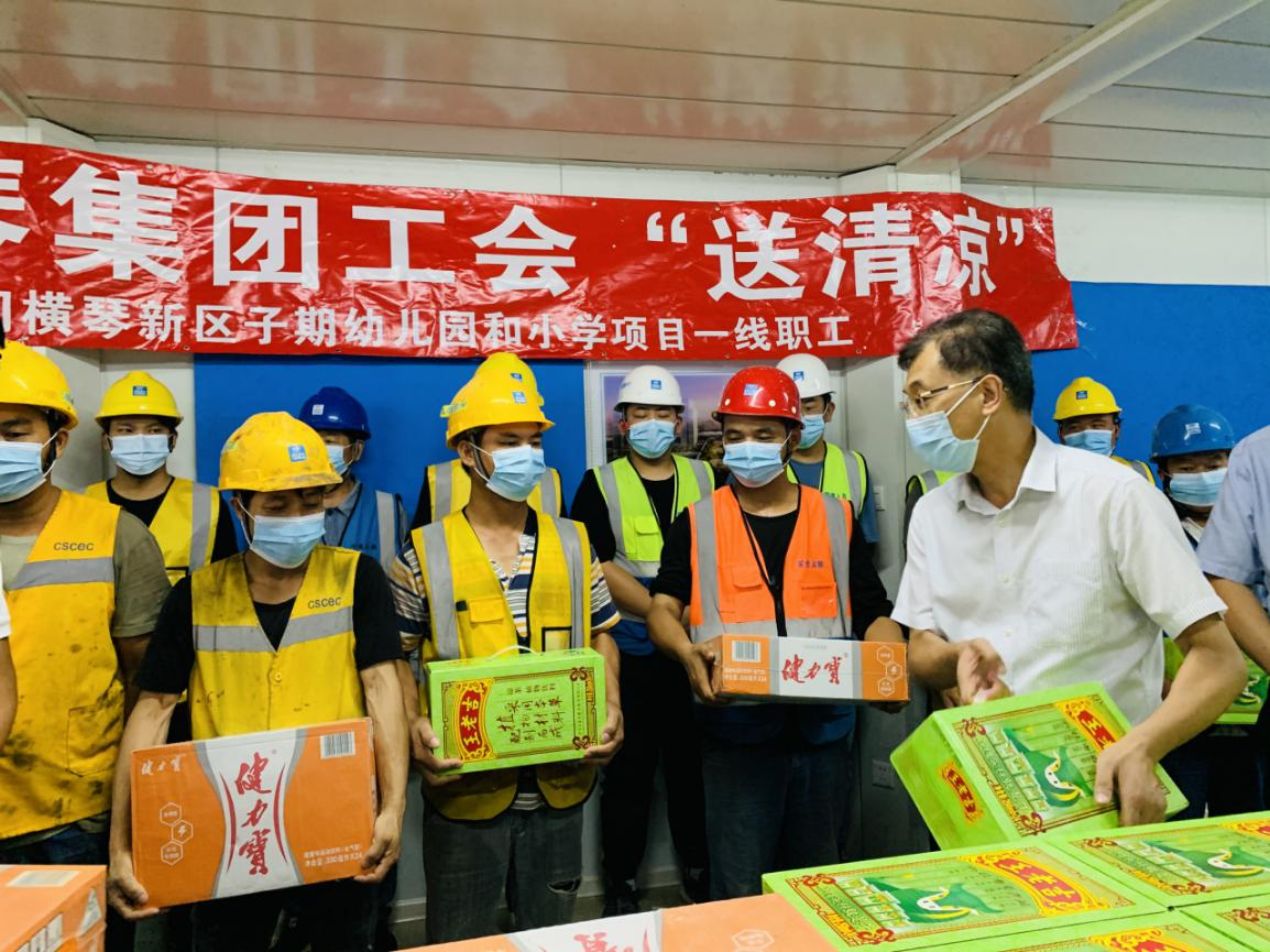 為進一步加強高溫作業(yè)職工勞動保護工作,關(guān)愛堅守在項目一線的建設(shè)者,2021年7月,大橫琴集團黨委書記、工會主席田偉帶隊分別赴科學(xué)城(二期)標(biāo)段一、標(biāo)段二項目、橫琴醫(yī)院項目、橫琴新區(qū)子期幼兒園和小學(xué)及保稅一小工程項目開展夏日送清涼慰問活動。