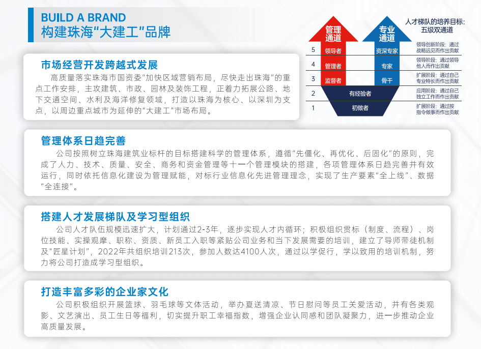 珠海建工集團(tuán)自正式運(yùn)營以來,通過短短兩年時間的精心謀劃、積極應(yīng)對、主動作為,業(yè)務(wù)承攬量實現(xiàn)了從拾億級到百億級的突破,主要經(jīng)營業(yè)績實現(xiàn)了質(zhì)的提升,資產(chǎn)規(guī)模和人才隊伍也呈十倍級地迅速壯大,更榮獲了“AAA信用企業(yè)”、“高新技術(shù)企業(yè)”等一項項殊榮。也在高質(zhì)量發(fā)展的征程中,錘煉鍛造了一支堪當(dāng)重任的干部隊伍。