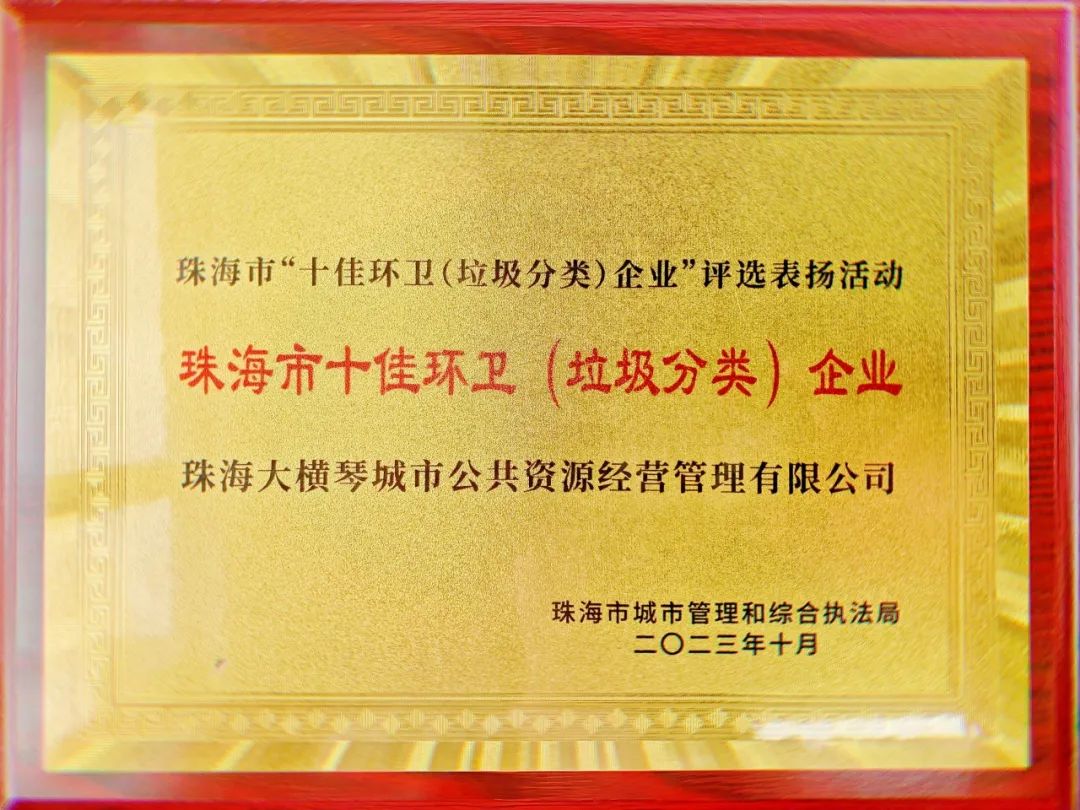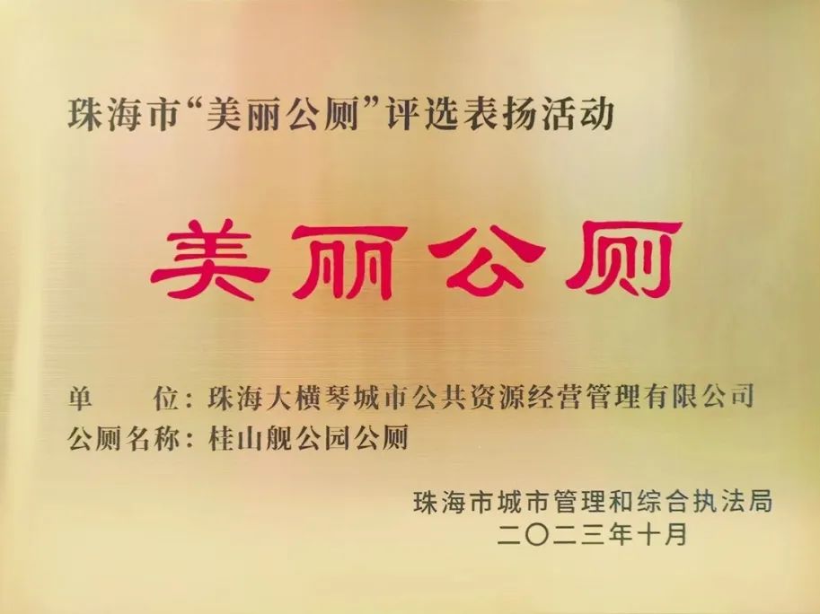 喜訊!日前在珠海市城市管理和綜合執(zhí)法局舉辦的評(píng)選表?yè)P(yáng)活動(dòng)中,大橫琴城資 榮獲2023年珠海市“十佳環(huán)衛(wèi)(垃圾分類)企業(yè)”稱號(hào), 由大橫琴城資管養(yǎng)的桂山艦公園公廁榮獲2023年珠海市“美麗公廁”稱號(hào)。