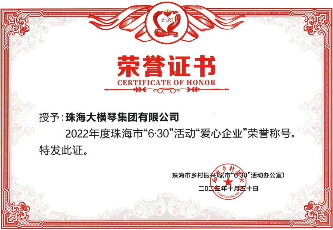 為深入貫徹黨的二十大和中央農(nóng)村工作會(huì)議精神,落實(shí)市委、市政府關(guān)于統(tǒng)籌實(shí)施鄉(xiāng)村振興戰(zhàn)略和“百縣千鎮(zhèn)萬(wàn)村高質(zhì)量發(fā)展工程”工作部署,匯聚更多社會(huì)力量參與“6·30”活動(dòng),鞏固脫貧成果、助力鄉(xiāng)村振興、促進(jìn)共同富裕,根據(jù)《中共珠海市委農(nóng)村工作領(lǐng)導(dǎo)小組〈關(guān)于印發(fā)珠海市2023年“6·30”助力鄉(xiāng)村振興活動(dòng)工作方案〉的通知》(珠委農(nóng)組〔2023〕6號(hào))精神,市鄉(xiāng)村振興局(市6·30活動(dòng)辦)開(kāi)展2022年度珠海市“6·30”活動(dòng)“愛(ài)心企業(yè)、愛(ài)心團(tuán)體、愛(ài)心個(gè)人”評(píng)選活動(dòng),向社會(huì)傳遞珠海人民樂(lè)善好施的精神品德,激發(fā)社會(huì)各界共襄善舉、助力鄉(xiāng)村振興。經(jīng)評(píng)審,珠海大橫琴集團(tuán)有限公司(以下簡(jiǎn)稱(chēng)大橫琴集團(tuán))被授予2022年度珠海市“6·30”活動(dòng)“愛(ài)心企業(yè)”榮譽(yù)稱(chēng)號(hào)。