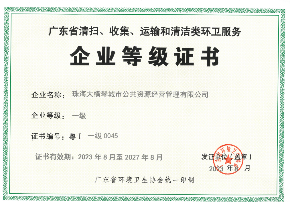 2023年,大橫琴城資榮獲“廣東省清掃、收集、運(yùn)輸和清潔類環(huán)衛(wèi)服務(wù)企業(yè)”一級(jí)評(píng)定和珠海市“十佳環(huán)衛(wèi)(垃圾分類)企業(yè)”稱號(hào)。