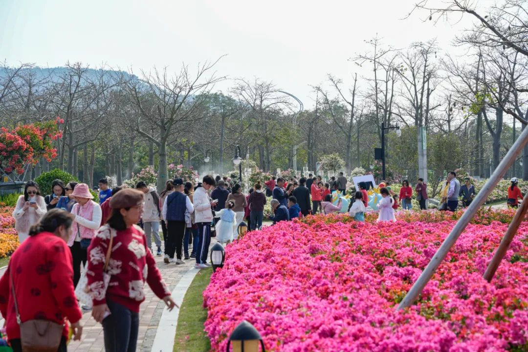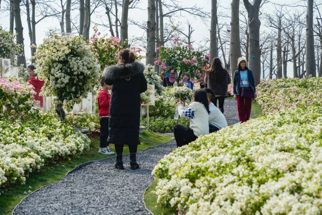 其中,花海長(zhǎng)廊的簕杜鵑園成為熱門(mén)打卡地,色彩斑斕的花朵絢爛盛放,設(shè)計(jì)師將靈感奇思揉進(jìn)景觀空間四個(gè)分區(qū),占地總面積達(dá)5000平方米,打造冰天雪地-粉妝玉砌-紅妝素裹-前橙似錦四大板塊的簕杜鵑專類(lèi)展園,引來(lái)大量游客前來(lái)拍照打卡。