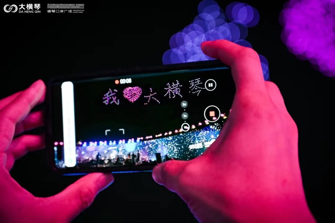 當(dāng)晚,橫琴口岸正上空,還演繹了一場(chǎng)點(diǎn)亮夜空、打破傳統(tǒng)的星空大秀。一架架無(wú)人機(jī)排著整齊的隊(duì)列,在夏日的夜空里亮起了點(diǎn)點(diǎn)星光。機(jī)群盤(pán)旋上升匯聚,在空中先后編織出“我愛(ài)橫琴”、“25”、“金蓮花”等一個(gè)個(gè)絢麗的方陣,在夜空中留下了一個(gè)個(gè)美好的祝福,而在場(chǎng)的觀眾也隨著無(wú)人機(jī)方陣的變化,許下對(duì)琴澳協(xié)同發(fā)展的美好期許。