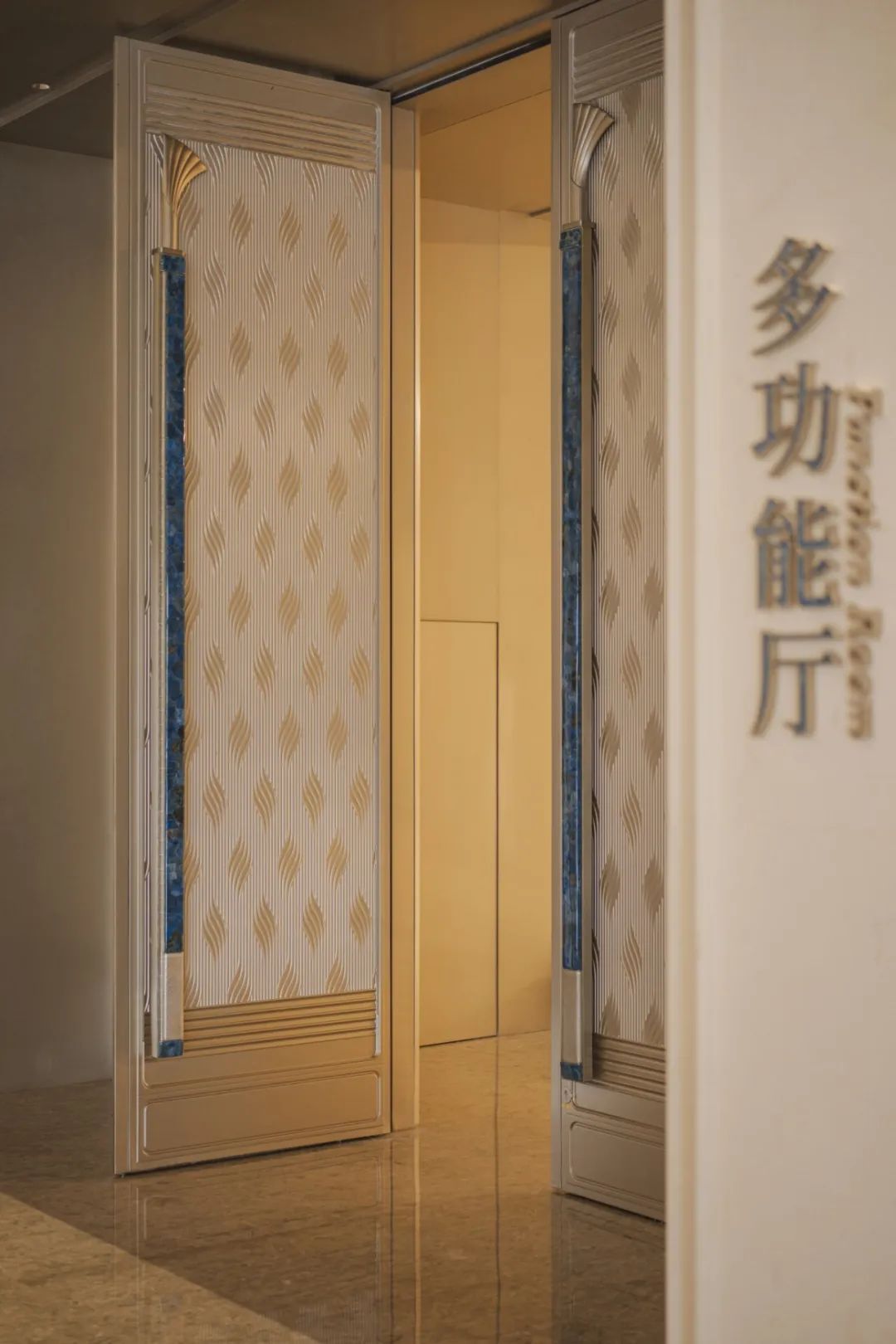 會議中心前廳頂面采用25朵花代表澳門回歸祖國25周年,造型中提取木棉花、蓮花寫意形體作為裝飾元素,圖案相互交錯,寓意“一國兩制”方針下粵澳共商、共建、共管、共享的新模式。