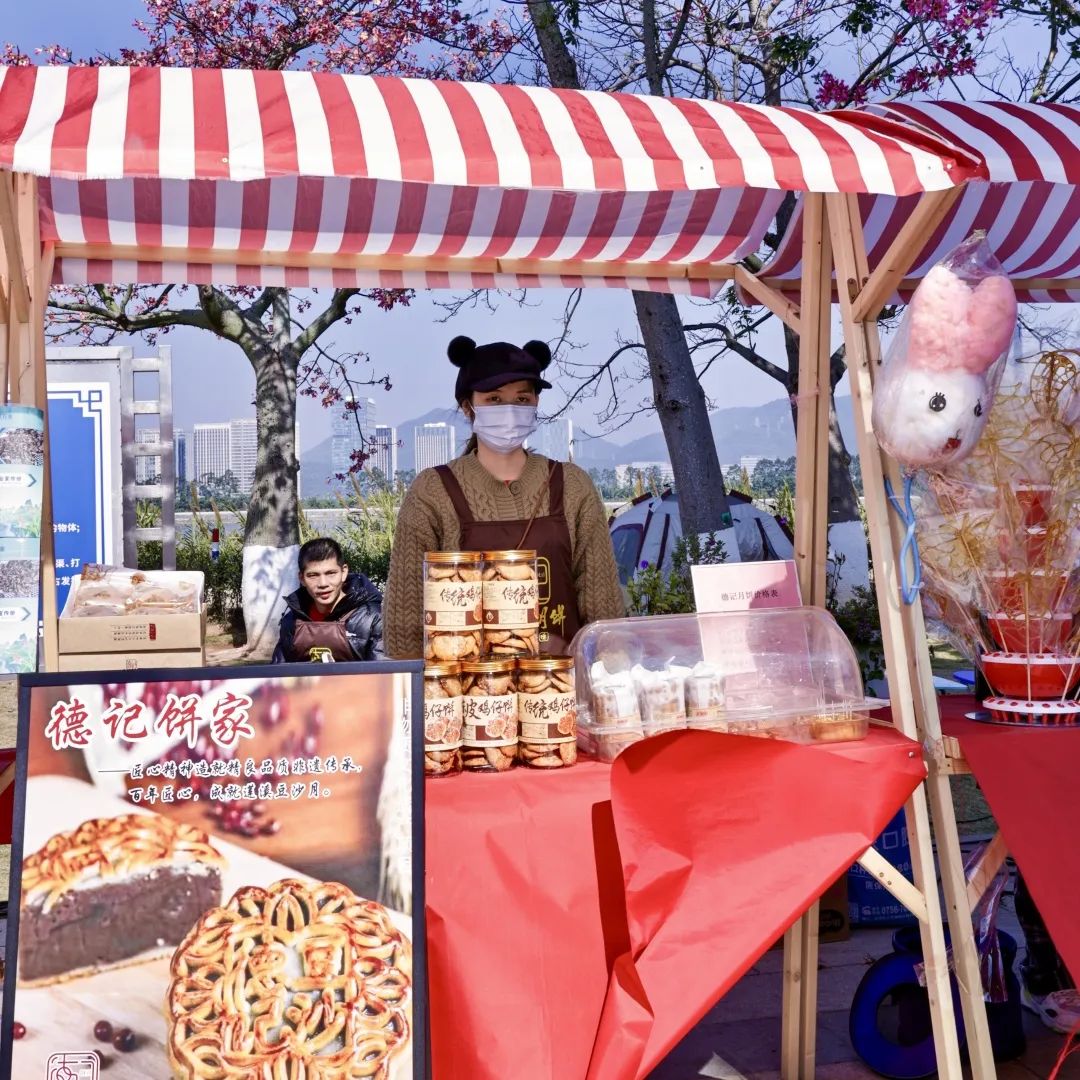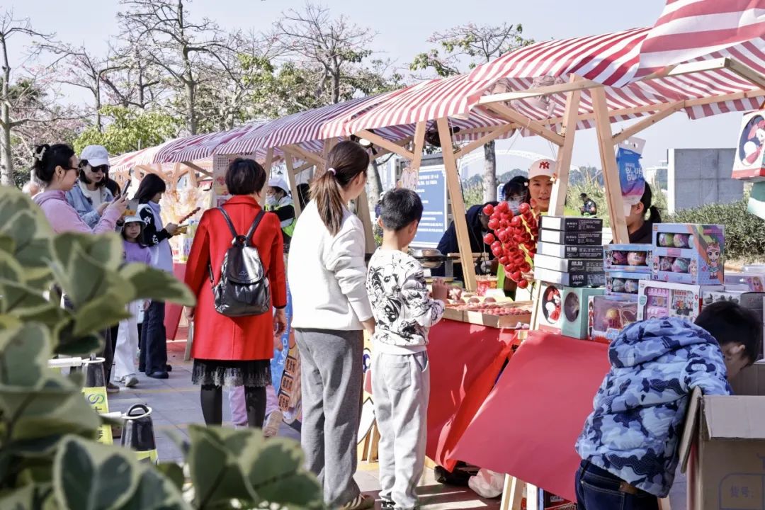 除此之外,每逢周末,一號、二號和三號驛站開展東灣墟市活動(dòng),斗門蓮洲鎮(zhèn)東灣村農(nóng)產(chǎn)品市集走進(jìn)花海,帶來優(yōu)質(zhì)的本地產(chǎn)綠色農(nóng)產(chǎn)品、特色手工糖水和農(nóng)副產(chǎn)品、非遺點(diǎn)心小吃等,吸引了大批市民游客上前詢問和購買。游客在享受美景、體驗(yàn)美食之旅的同時(shí),亦促進(jìn)了鄉(xiāng)村振興與滿足城鎮(zhèn)消費(fèi)需求的良性循環(huán),鄉(xiāng)村市集在花海煥發(fā)出了新活力。