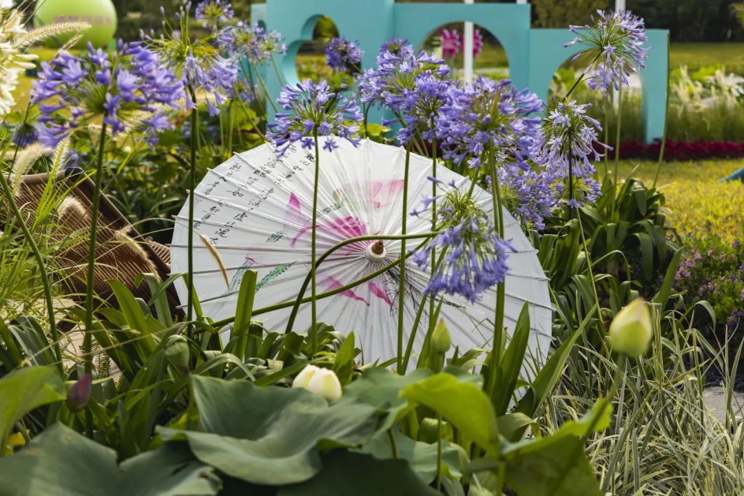 展園整體以典雅氛圍為基調,白荷花與藍紫色的百子蓮則為點睛之筆,形成視覺焦點,現代素材與傳統(tǒng)意境相互碰撞,打造清新與浪漫的場景。