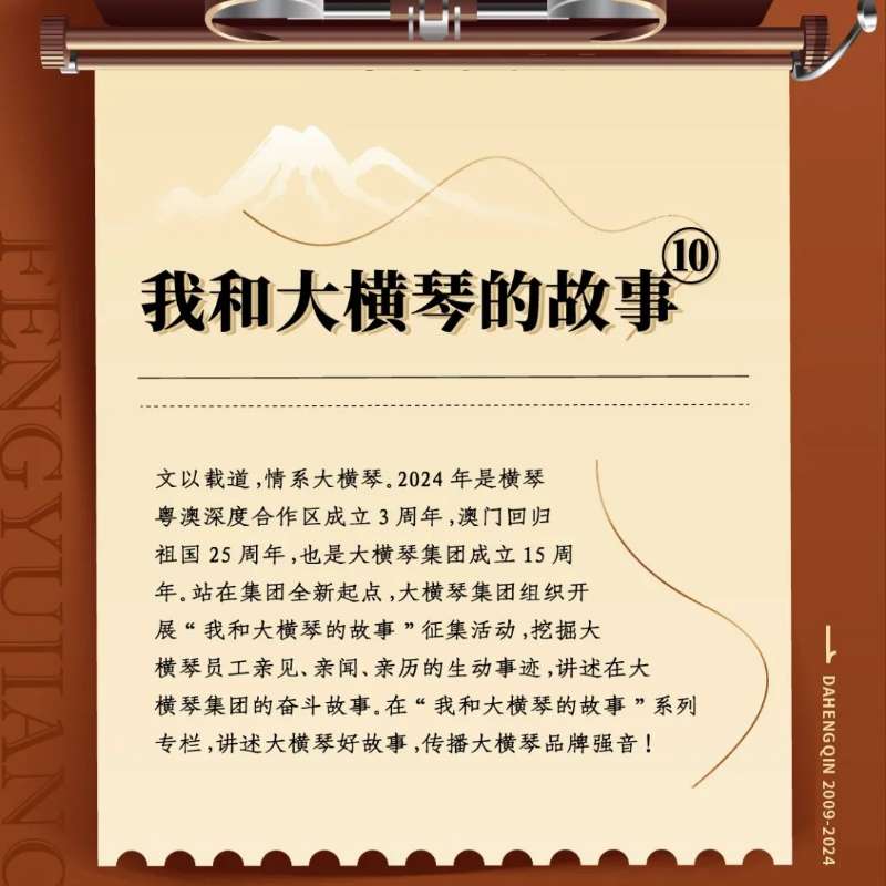 文以載道,情系大橫琴。2024年是橫琴粵澳深度合作區(qū)成立3周年,澳門回歸祖國25周年,也是大橫琴集團成立15周年。站在集團全新起點,大橫琴集團組織開展“我和大橫琴的故事”征集活動,挖掘大橫琴員工親見、親聞、親歷的生動事跡,講述在大橫琴集團的奮斗故事。大橫琴集團公眾號將陸續(xù)推出“我和大橫琴的故事”系列專欄,講述大橫琴好故事,傳播大橫琴品牌強音!